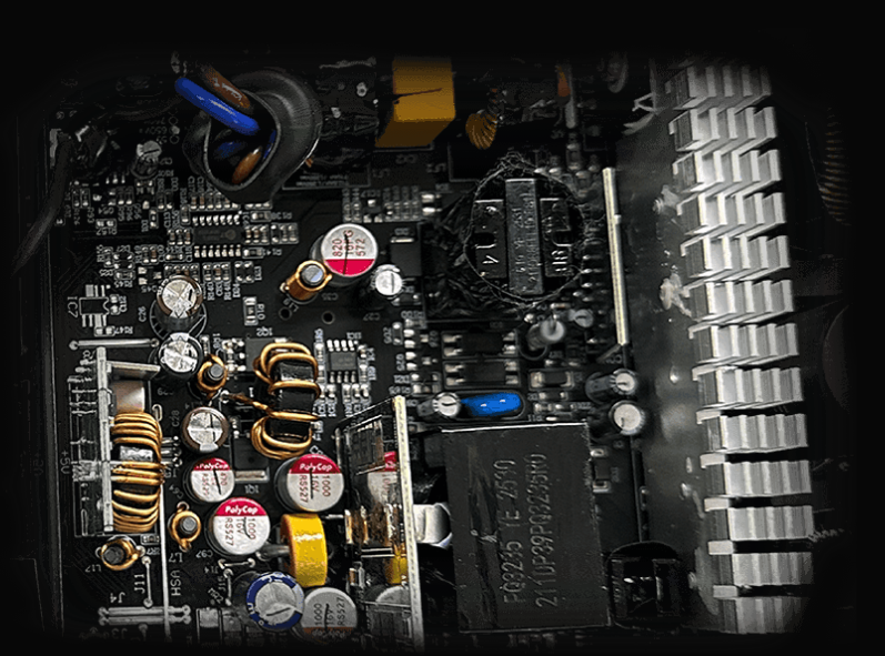 LLC半橋諧振結構確保低載至高載的輸出電壓,保持最小值電性頻率跳動,並配合DC-DC模組調節電壓, 提供高穩定高相容的電力供給。