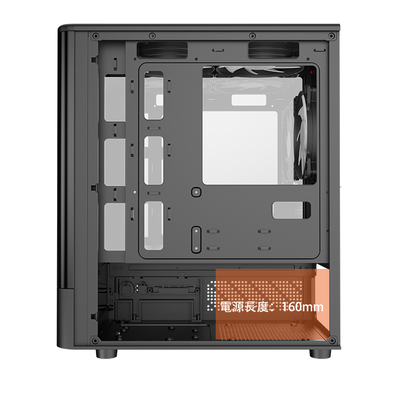 支援多風扇安裝配置:頂部 120mm ×2、後部 120mm ×1、底部 120mm ×2,全面打造卓越散熱效能,確保系統長時間穩定運行。