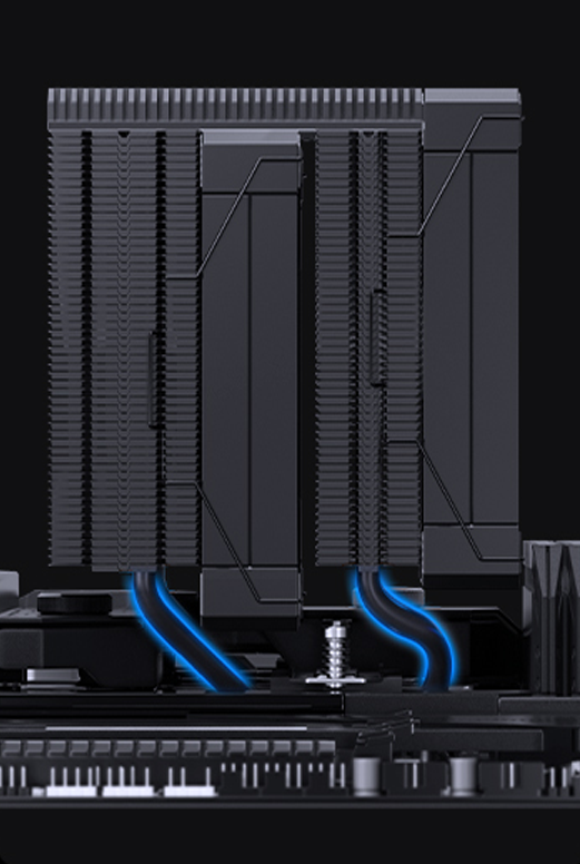 採用 8根高效熱導管,搭配 雙塔鰭片結構,大幅提升散熱接觸面積,迅速導熱、降低核心溫度。