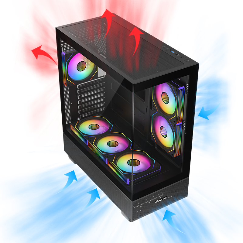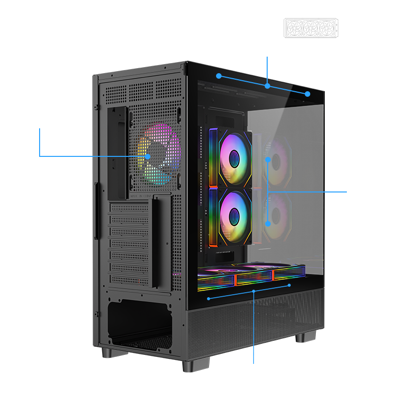 支援頂部三組120mm風扇、後部一組120mm風扇、電源艙三組120mm風扇安裝,以及主機板側邊兩組120mm風扇,提供卓越的散熱性能,確保系統穩定運行。